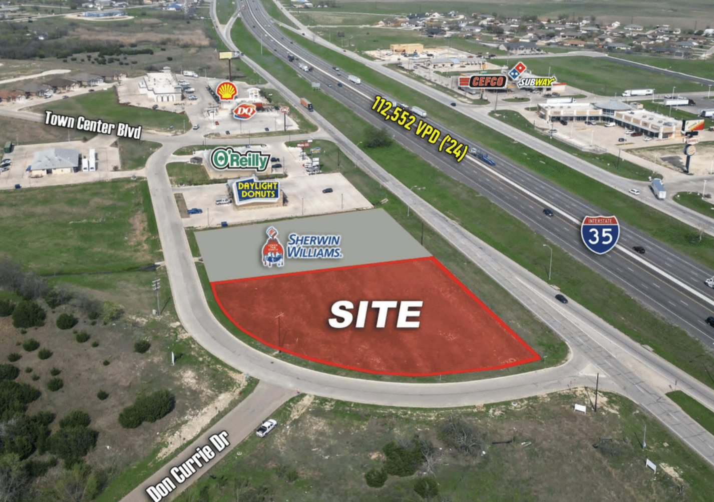 - Frontage: ±235 ft of frontage on S IH-35 Service Road & ±400 ft on Town Center Blvd